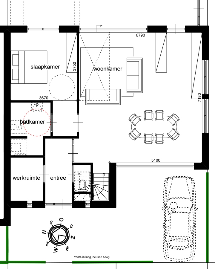 In de nieuwe plattegrond had de architect veel uit mijn ontwerp overgenomen en zelf ook ideeën voor de indeling verwerkt. Helaas sloten zijn voorstellen niet aan op de situatie van deze klant: een echtpaar op leeftijd, meneer is slecht ter been, ze gaan beneden wonen en de bovenverdieping is alleen voor gasten en opslag.