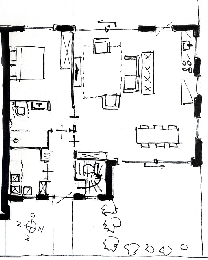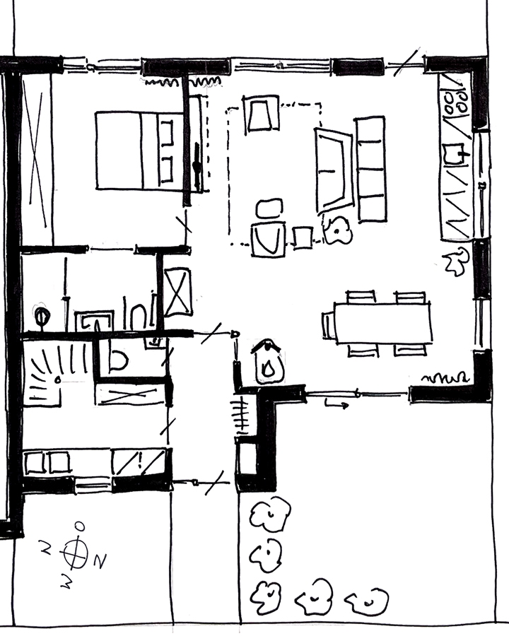 Het uitgangspunt voor de indeling en inrichting was een ruim en praktisch huis te creëren, waarin de bewoners zich makkelijk kunnen bewegen. Een huis waar het mogelijk is alleen beneden te wonen zodra dat aan de orde is en met voldoende bergruimte op de begane grond. Met alle input van de bewoners ging ik aan de slag om mijn eerste voorstel aan te scherpen. Ik maakte verschillende indelingsschetsen voor de begane grond en de bovenverdieping, waar een logeer- en badkamer komen en ruimtes voor opslag en techniek. De klant heeft een weloverwogen keuze gemaakt en bij de volgende afspraak met de architect ben ik er ook bij.